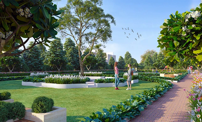 Landscaped green space with plantation for better experience.